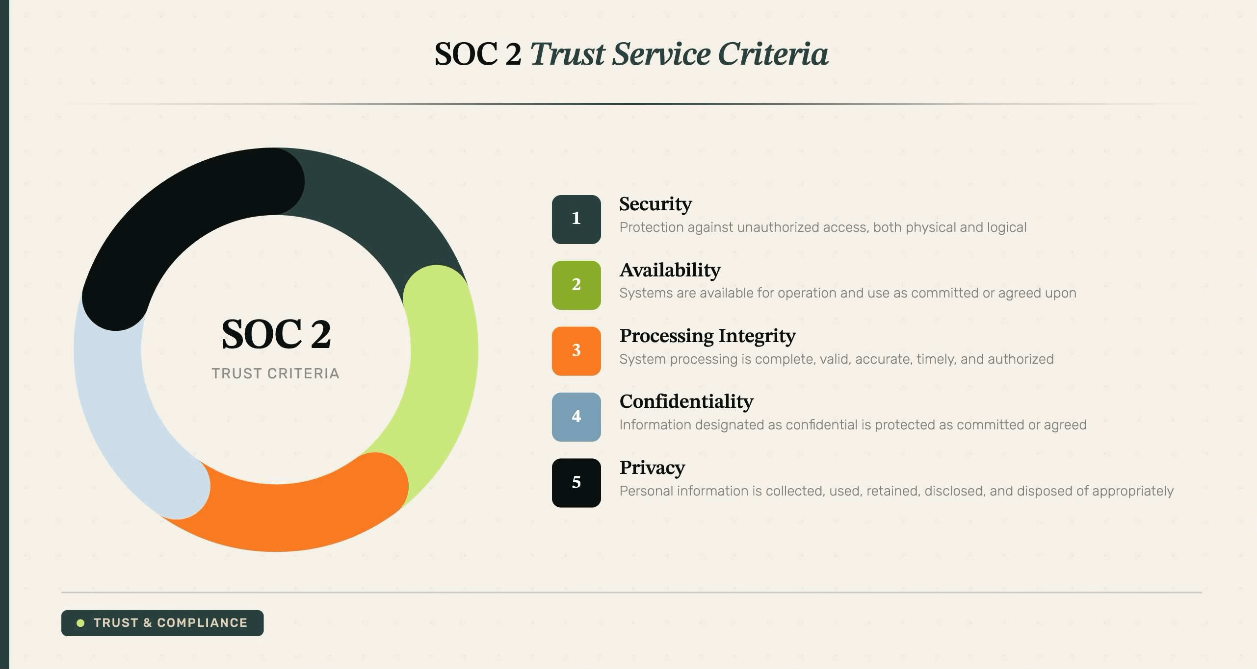 SOC 2 is built around five Trust Services Criteria. If you happen to be audited against these, you don’t have to be audited against all five; however, security is always a requirement.